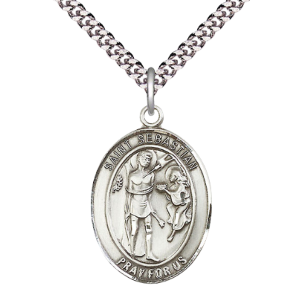 Sterling Silver St. Sebastian Medal – Oval Patron Series with 24” Light Rhodium Heavy Curb Chain